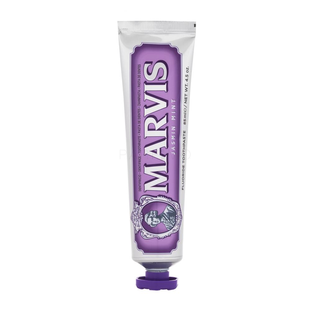 Die reichhalte Zahnpaste Marvis Toothpaste Jasmin Mint mit einem Jasmin-Minz-Aroma entfernt Plaque. Das Aroma der Zahnpaste hinterlässt einen angenehm frischen Atem und das Gefühl von Reinheit.