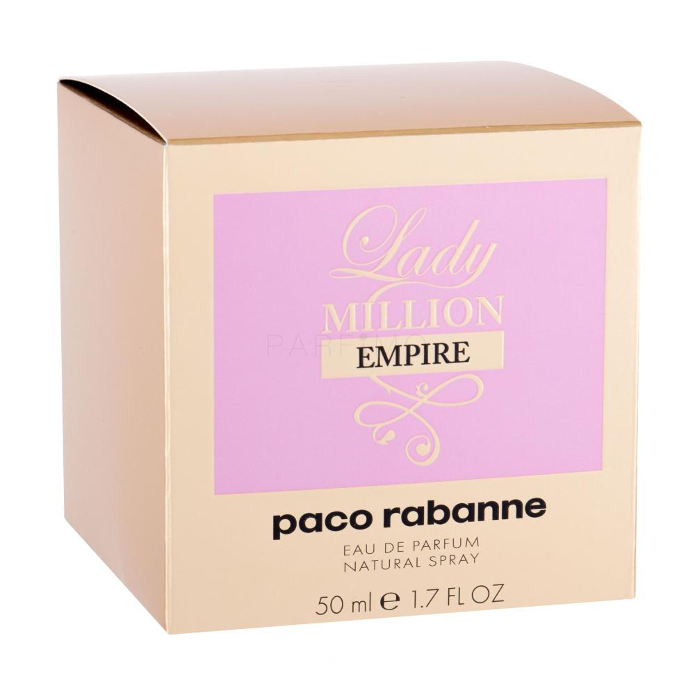 Nach positiven Anklängen, die die Marke Paco Rabanne mit dem Duft 1 Million bemerkt hat, stelte sie im Jahr 2010 auch die Damenkomposition Lady Million vor. Der in einem Flakon in Form eines Diamanten versteckte Duft wird die temperamentvolle Frau fesseln, die an ihren Meinungen festhaltet, das Leben in vollen Zügen genießt und Ihre breite Umgebung inspiriert. “Das Gold verführte Menschen in allen Zivilisationen und Religionen. Es ist überall zum Beispiel in der Architektur, Design, Schmuck, Accessoire und Mode,“ erklärte der Parfummeister Paco Rabane, der nicht zögert, seinen Luxus zu zeigen. Jetzt können auch Sie die Variation Lady Million Empire aus dem Jahr 2019 probieren.